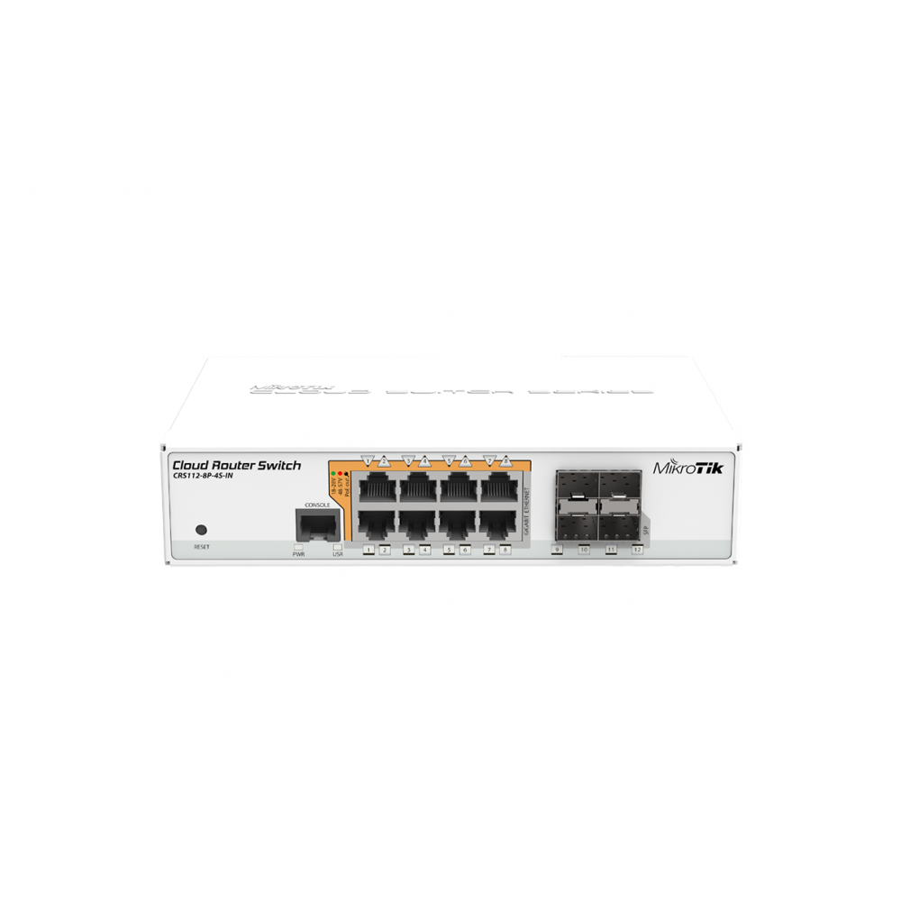Объединяя лучшие возможности полнофункционального маршрутизатора и коммутатора третьего уровня, Mikrotik CRS112-8P-4S оснащён 8 гигабитными портами и четырьмя шахтами SFP. Устройство поддерживает выходы РоЕ 802.3af/at (для пассивного РоЕ или РоЕ 802.3af/at предусмотрен отдельный вход питания) и выполнено в настольном корпусе.