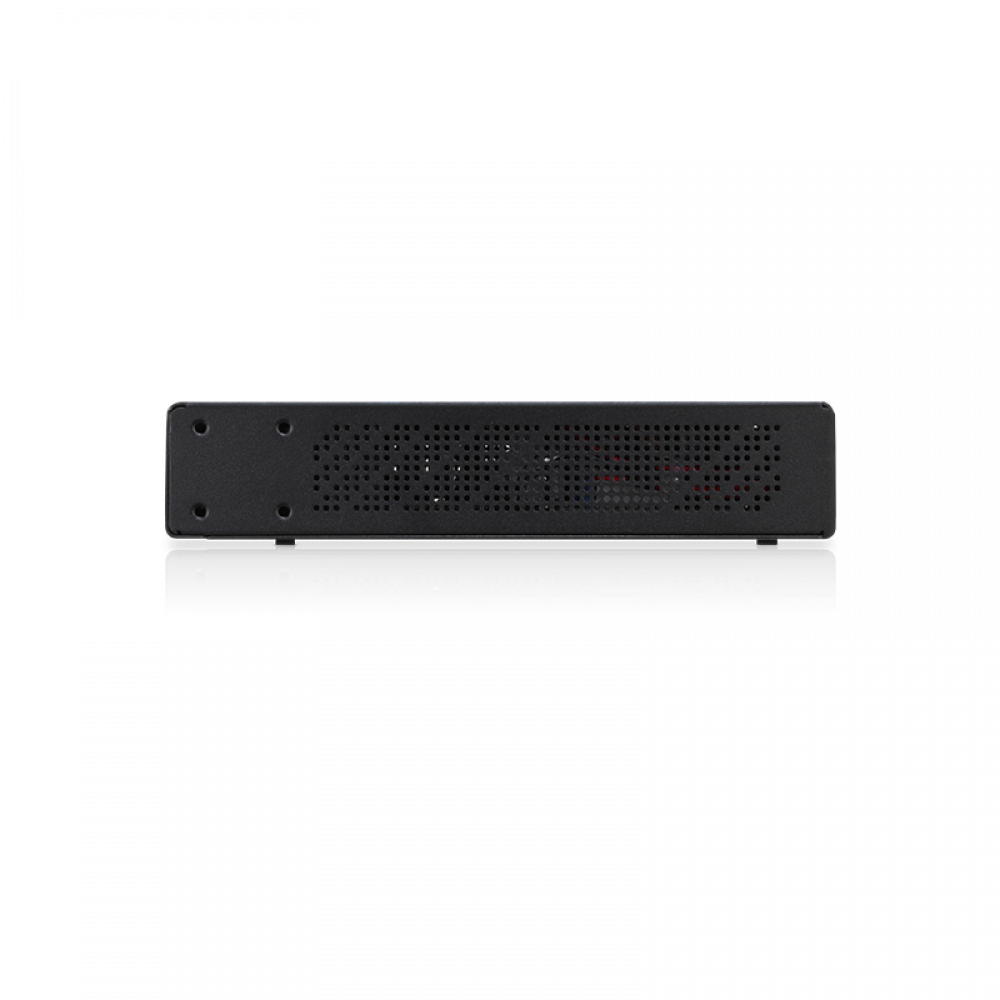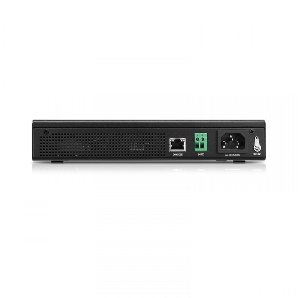 Сетевой интерфейс рассматриваемой модели состоит из 8 гигабитных портов Ethernet, каждый из которых может раздавать питание PoE согласно стандартам 802.3at/af Passive PoE 24V. Такой подход позволяет отказаться от дополнительных адаптеров питания, что существенно упрощает схему сети и ее обслуживание. Кроме этого, проектировщики предусмотрели два слота под SFP-модули для интеграции устройства в оптоволоконную сеть.