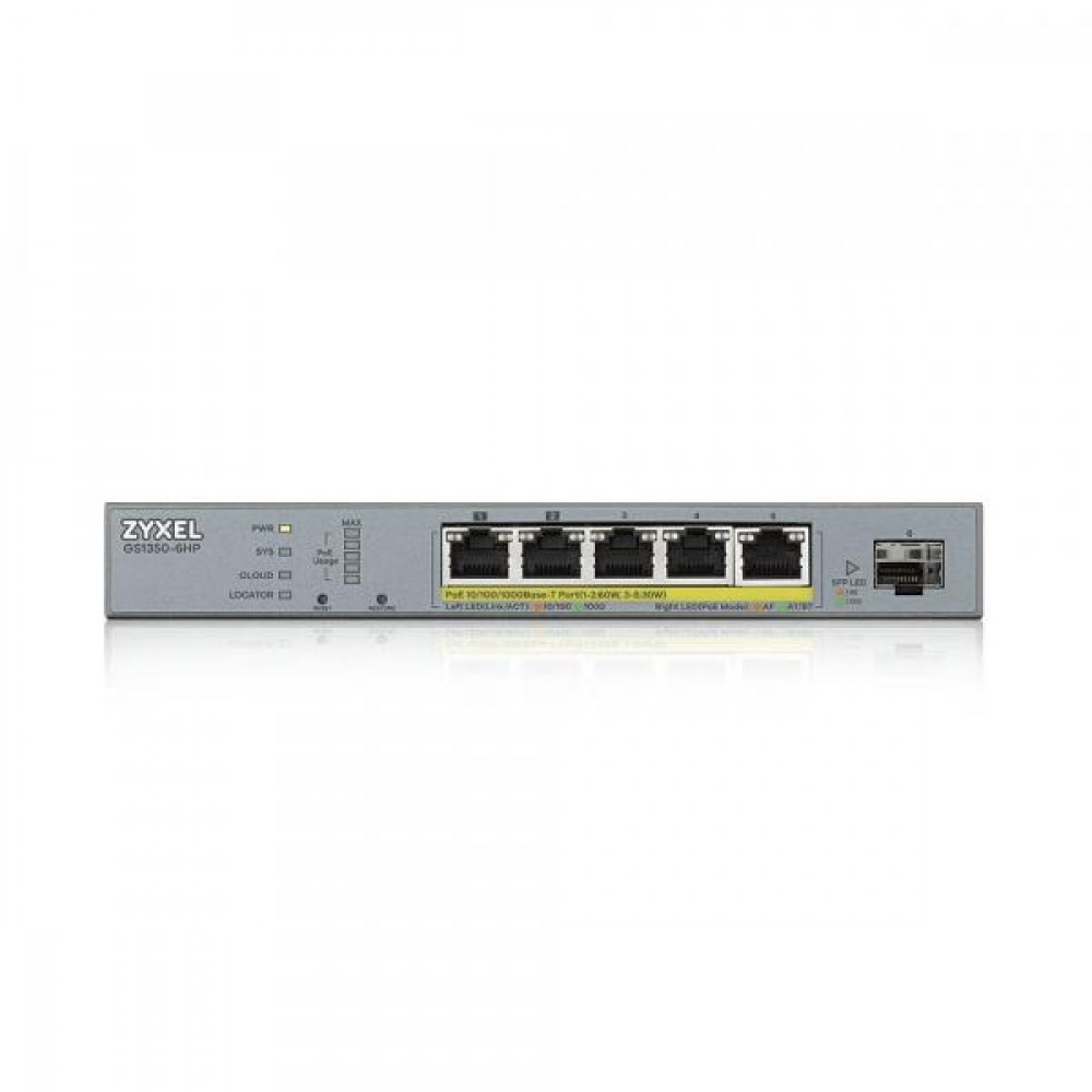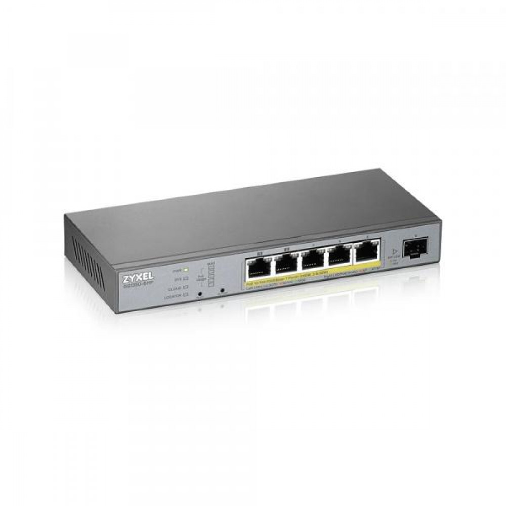 Управляемый гигабитный коммутатор Zyxel GS1350-6HP обладает поддержкой PoE. Устройство рассчитано на работу в составе систем видеонаблюдения, отличающихся значительным радиусом размещения IP-камер. Максимальная дальность обмена информацией и питания по Ethernet составляет 250 м. Коммутатор позволяет избежать затрат на оборудование линий электропитания. Общий бюджет PoE – 60 Вт. Общее количество портов – шесть (пять 1000Base-T и один SFP).