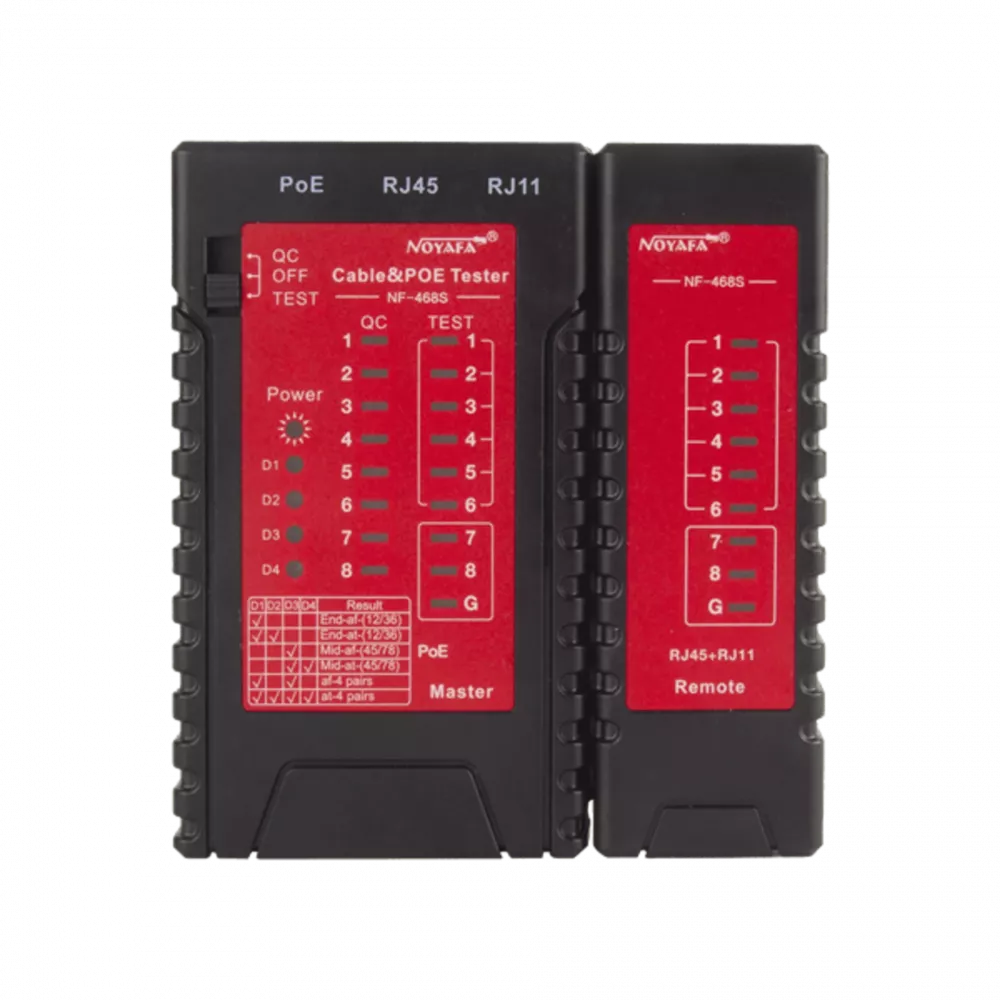Линейный тестер Noyafa-468S предназначен для проверки витопарного и телефонного кабеля, оконцованного коннекторами RJ-45, RJ-12, RJ-11 (8P8C, 6P6C, 4P4C). Данное устройство позволяет определить короткое замыкание, а также целостность и последовательность соединения жил кабеля.