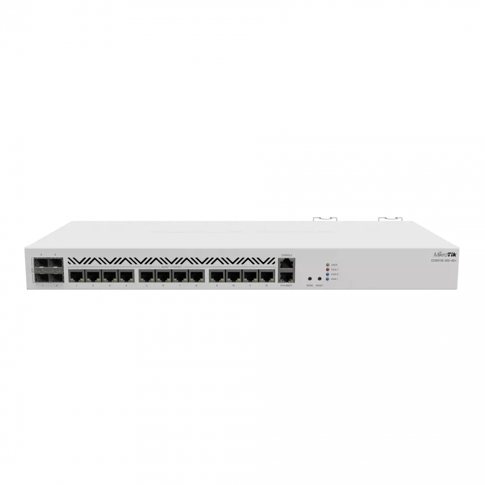 Мы хотели увидеть весь потенциал надежной сети 10G в сочетании с современным процессором. CCR2116-12G-4S+ позволяет забыть об ограничениях процессора в вашей системе. Как и его младший брат, великолепный CCR2004, этот маршрутизатор оснащен мощным процессором Amazon Annapurna Labs Alpine. Но с 16 ядрами, работающими на частоте 2 ГГц, этот CCR «съедает» другого за завтрак. Например, мы видим как минимум 15% прирост производительности на одном ядре. А это самый важный аспект, когда речь идёт о ресурсоёмких операциях, основанных на обработке данных на каждом соединении. Например, таких как очереди. CCR2116-12G-4S+ задаёт новый стандарт производительности на одном ядре во всём семействе продуктов CCR! И он поддерживает аппаратную разгрузку третьего уровня! Очевидно, что для использования всей этой мощности требуется правильное подключение. Имеется четыре порта 10G SFP+. Они подключены к отдельной полнодуплексной линии связи к чипу коммутатора семейства Marvell Aldrin. Также имеются порты Gigabit Ethernet. 12 из них работают через чип Marvel. Ещё один порт Gigabit Ethernet подключен непосредственно к процессору. Он предназначен для управления.