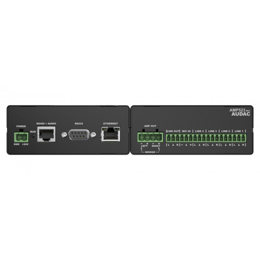AMP523 — это мини-стереоусилитель со встроенным веб-блоком управления с четырьмя линейными стереовходами и одним симметричным микрофонным входом с фантомным питанием. Его выходная мощность составляет 2 x 15 Вт.