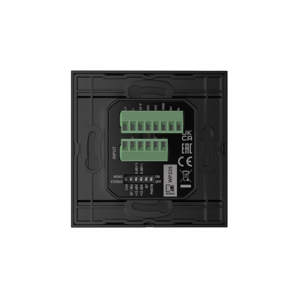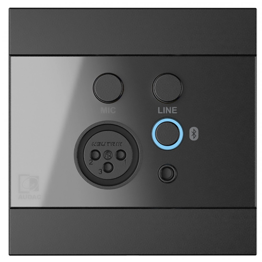 AUDAC WP225/B – встраиваемая настенная микшер-панель с Bluetooth-приемником для удаленного подключения источника звука с целью трансляции музыки через различные аудио устройства производства AUDAC: акустические системы ARES5A, серия аудиоматриц MTX, микшер-усилитель AMP523, микшеры-предусилители линейки PRE и другие.
