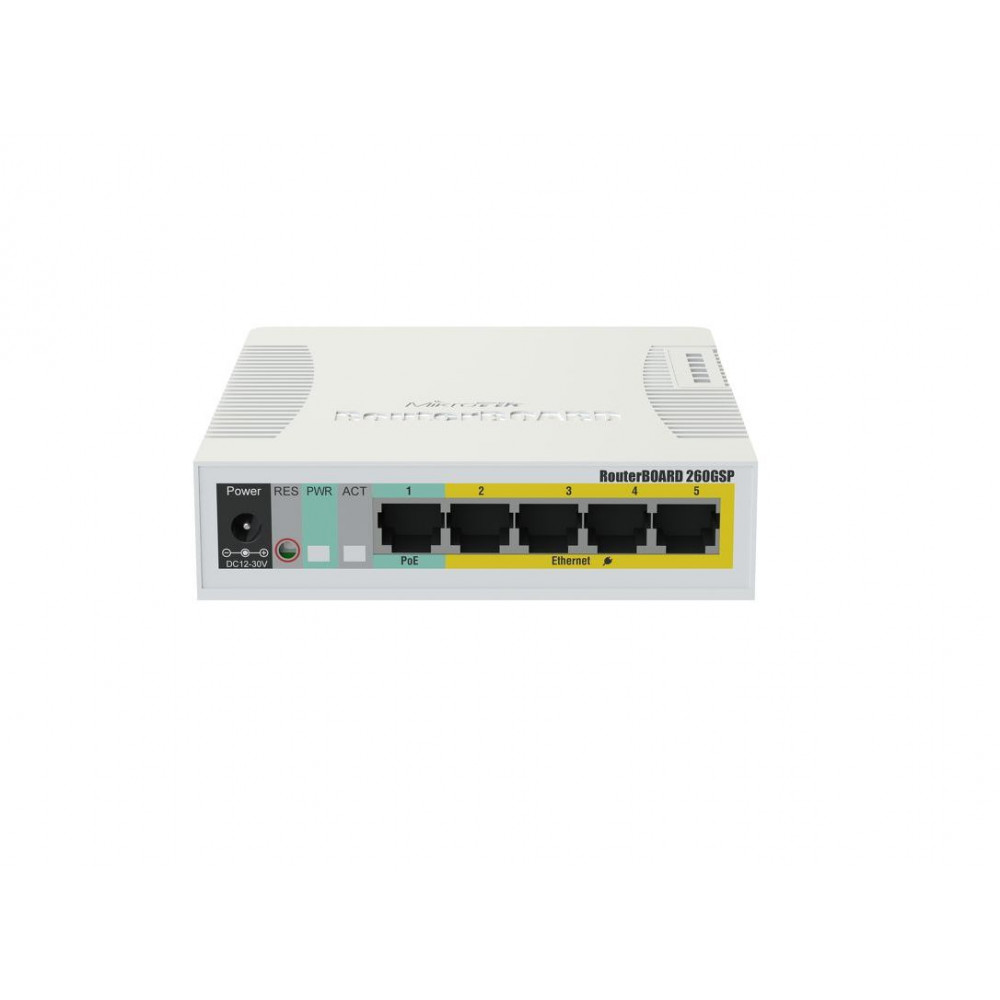 RB260GSP — это небольшой SOHO-коммутатор с выходом питания на Ethernet-порты. Порты 2–5 могут питать другие устройства с поддержкой PoE тем же напряжением, что и само устройство (только пассивное PoE по линиям передачи данных). RB260GSP оснащён пятью гигабитными Ethernet-портами и одним SFP-модулем. Коммутация осуществляется с помощью чипа Atheros Switch. Устройство работает под управлением операционной системы SwOS, разработанной специально для коммутаторов MikroTik.