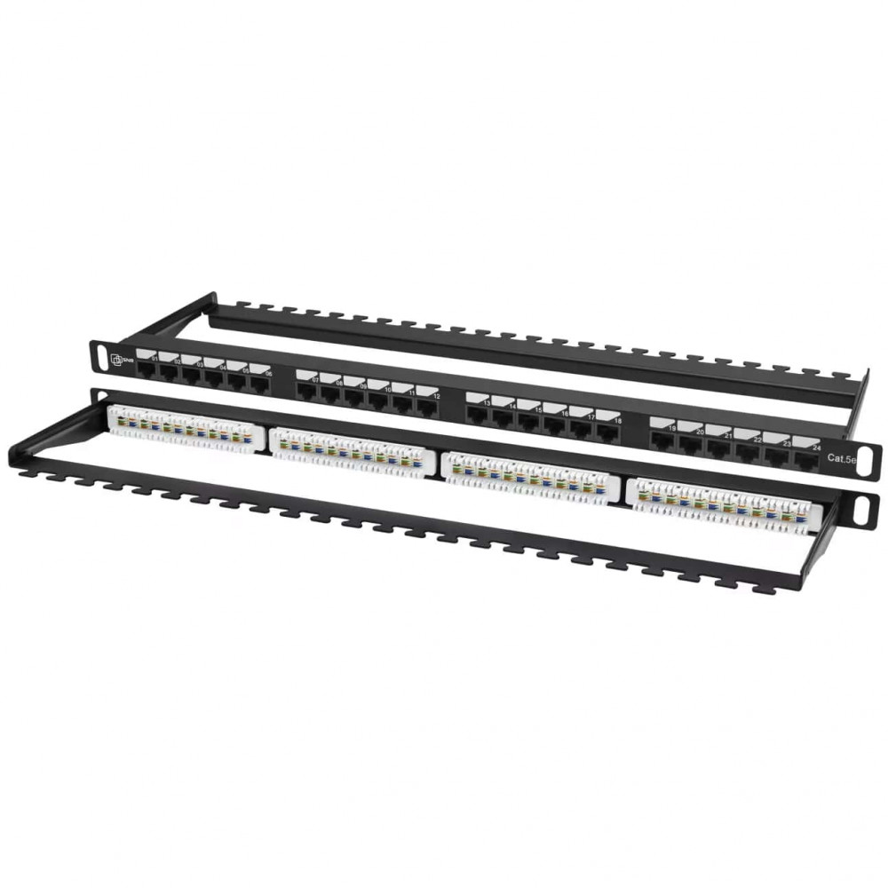 Данная патч-панель выполнена в неэкранированном исполнении, предназначена для установки в 19″ шкаф или стойку и имеет 24 порта RJ45/8P8 cat.5е. Высота патч-панели — 0,5U (22,23 мм). Тип заделки кабеля — горизонтальная.