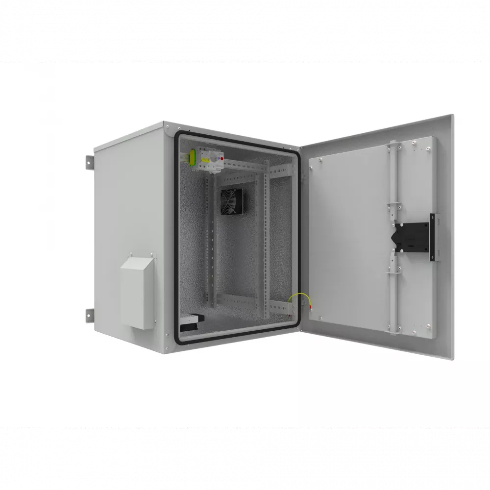 В шкафах с активной вентиляцией установлен вентиляторный модуль, с возможностью установки на "вдув" или "выдув". Защитная решетка позволяет предотвратить не только механические воздействия, но и попадание влаги внутрь шкафа.