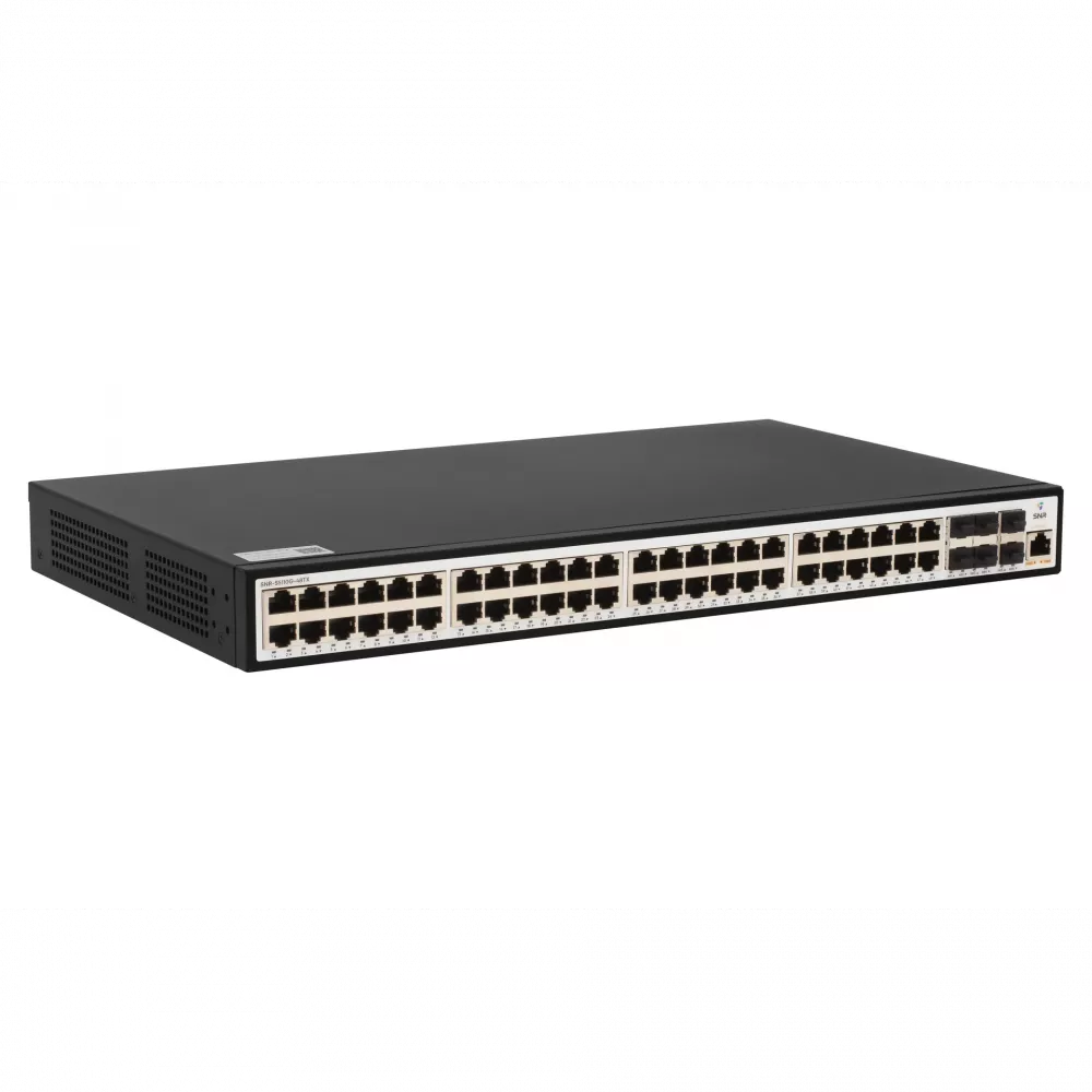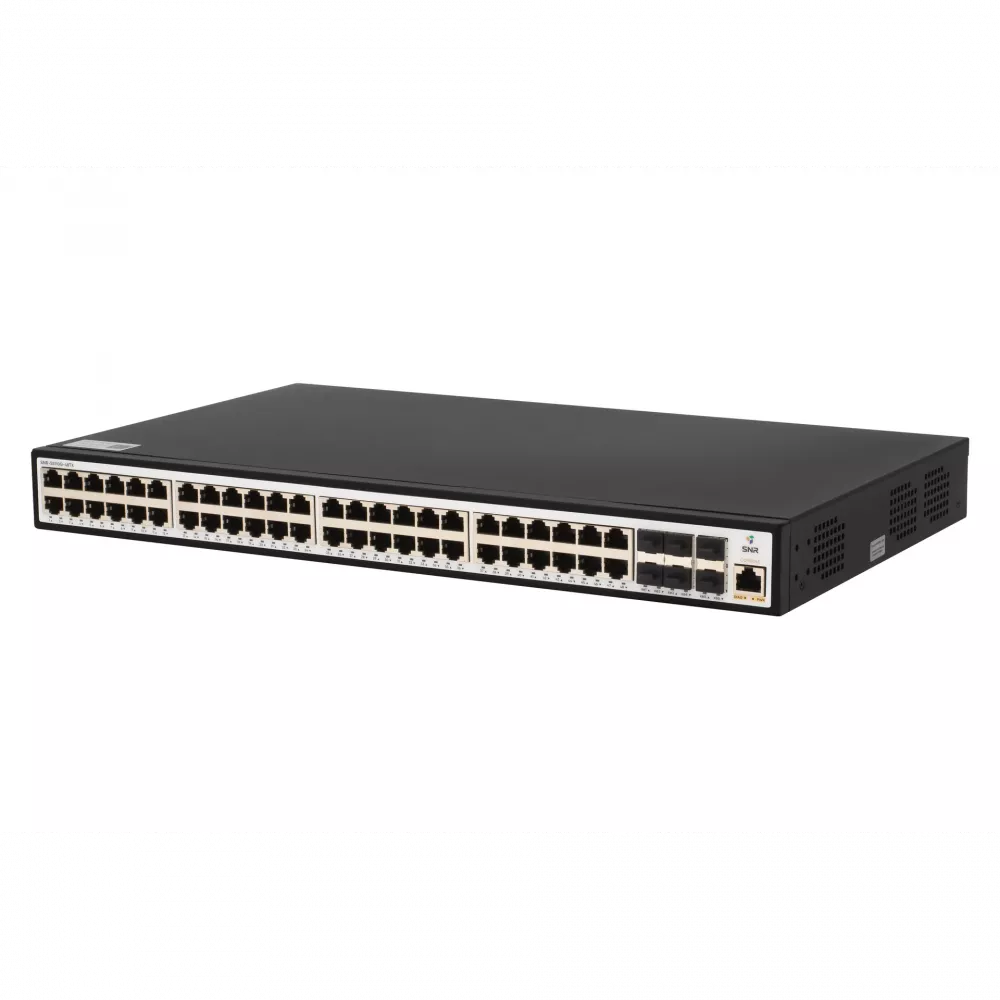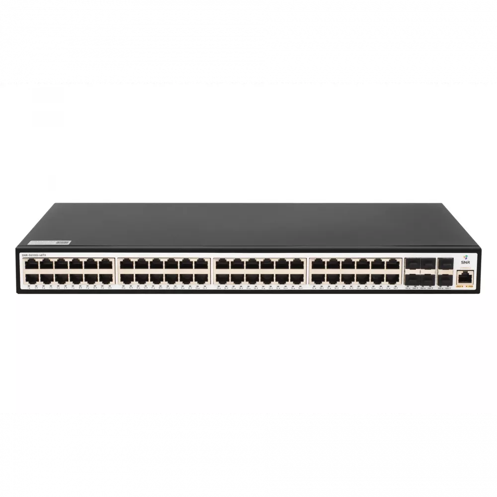 SNR-S5110G-48TX — бюджетный управляемый коммутатор L2+ уровня с 48 гигабитными портами и 6 uplink-портами 10G SFP+. Предназначен для построения сетей доступа, где требуется высокая плотность подключения и базовая отказоустойчивость. Модель ориентирована на экономичное решение с поддержкой широкого набора функций L2/L3, но без расширенных возможностей питания и мониторинга, доступных в более старших сериях.