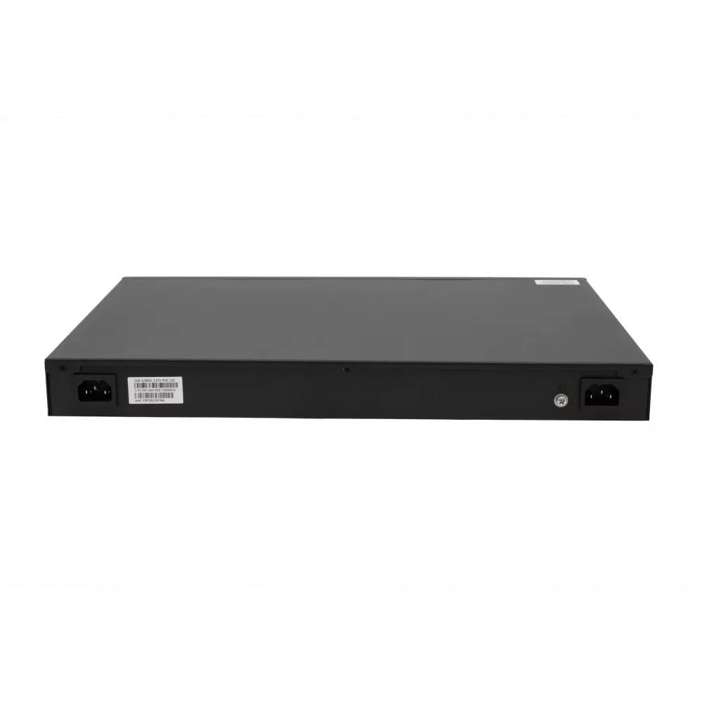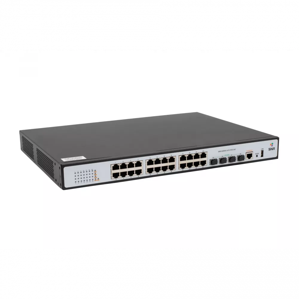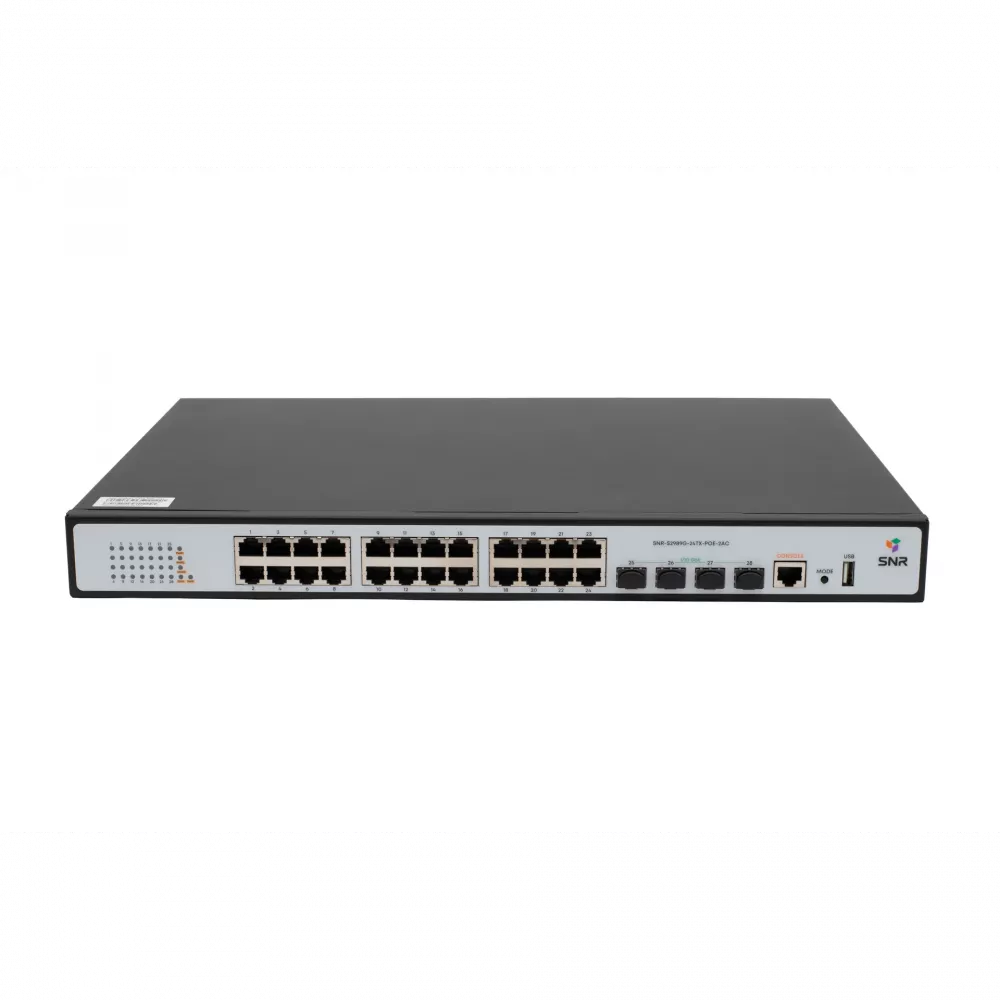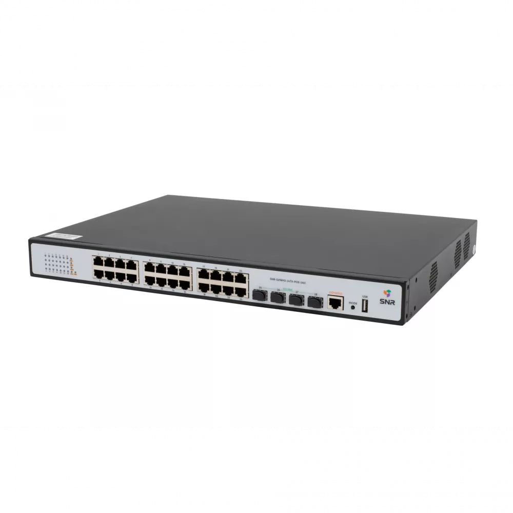 SNR-S2989G-24TX-POE-2AC — L2+ коммутатор с 24 портами Gigabit Ethernet, 4 SFP+ uplink-портами и поддержкой PoE (370 Вт). Оснащён двумя встроенными БП для резервного питания и поддержкой стекирования VSF HA. Поддерживает статическую маршрутизацию, QoS, multicast, защиту 4kV и тестирование кабеля.