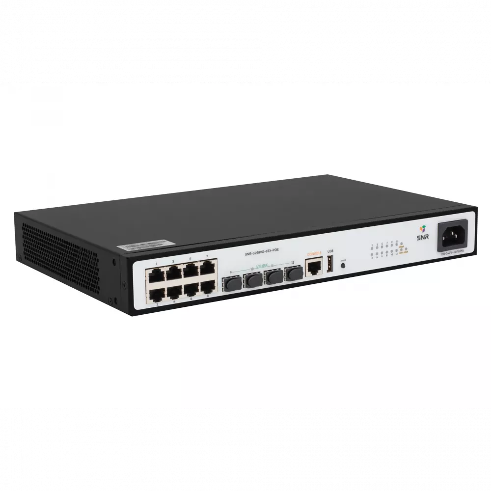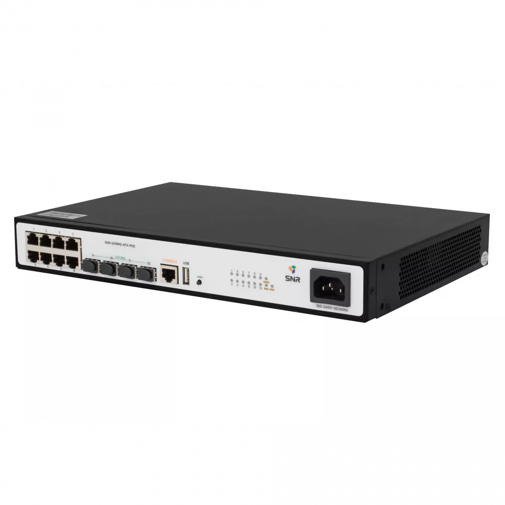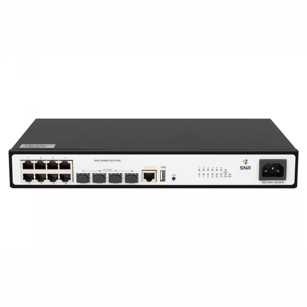 SNR-S2989G-8TX-POE — компактный управляемый L2-коммутатор уровня доступа с поддержкой PoE, стековой архитектуры VSF HA и uplink-портами 1/10G SFP+. Подходит для построения высокоскоростных сетей в офисах, бизнес-центрах, небольших ЦОД и телеком-инфраструктуре с PoE-устройствами.