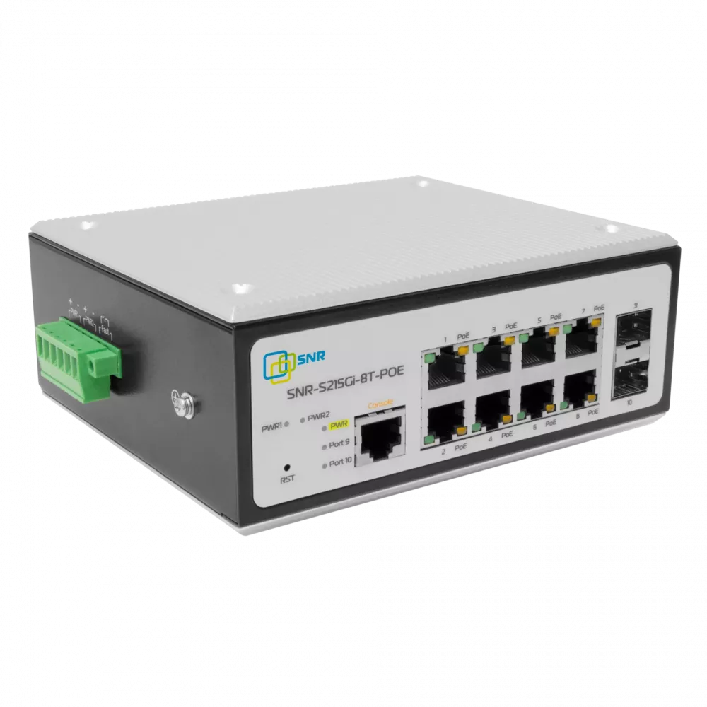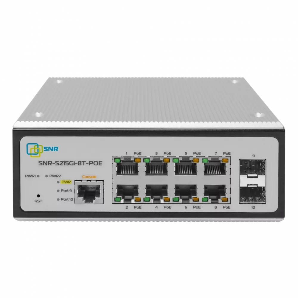 Управляемый промышленный POE коммутатор уровня 2 SNR-S215Gi-8T-POE в промышленном исполнении. Оборудование имеет уровень защиты IP40, расширенный температурный диапазон эксплуатации от -40С до +85°C и встроенную грозозащиту до 4kV на всех медных портах.